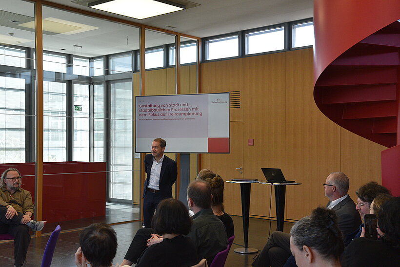 Aus der Schader-Stiftung erläuterte Alexander Gemeinhardt Grundfragen der Dialogfähigkeit gesellschaftlicher Sektoren mit planerischen Disziplinen. Dr. Gösta Gantner gab Einblicke in die freiraumorientierten Projekte der Darmstädter Tage der Transformation, Dr. Sara Lüttich führte in internationale Perspektiven mit Blick auf das Engagement der Schader-Stiftung im Rahmen von WDC2026 ein.
