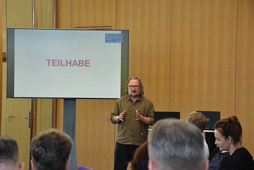 Aus Sicht der Landschaftsarchitektur gab Prof. Sebastian Sowa von der Hochschule Geisenheim nicht nur fachliche EInblicke in Projekte, sondern als bdla-Präsidiums-Mitglied auch in die grundlegende Haltung der Landschafts-, Grünflächen- und Freiraumplanung als wesentliche gestalterische Disziplin in den Herausforderungen einer sozial-ökologischen Transformation.