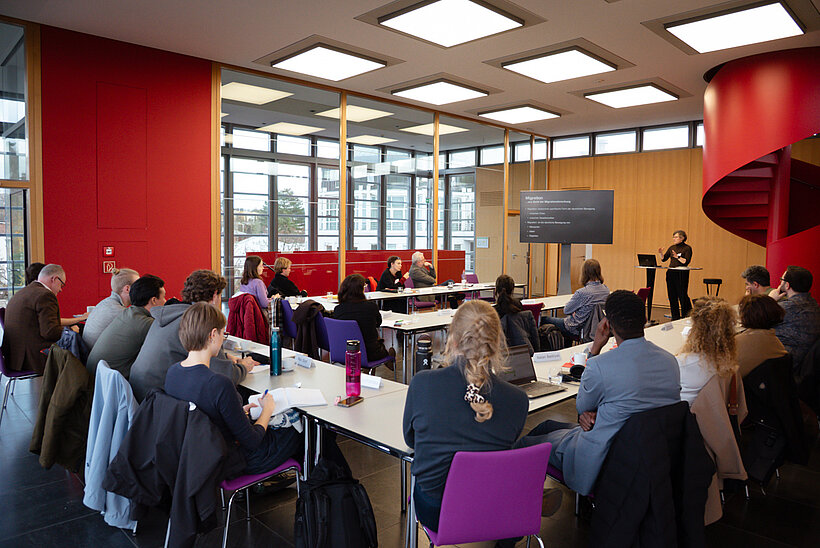 Die Veranstaltung bestand aus einem Teil mit wissenschaftlichem Charakter und einem Teil, der den Dialog mit der Praxis in den Mittelpunkt stellte. So berichteten und präsentierten die Promotionsstipendiat*innen aus ihren eigenen Forschungsarbeiten ihre Sicht auf grundsätzliche, im Rahmen der Forschung aufgetretene Fragen an das Thema „Migration“. Ihre Impulse waren Grundlage für die Diskussion unter den Stipendiat*innen sowie mit den anderen Gästen des Symposiums.